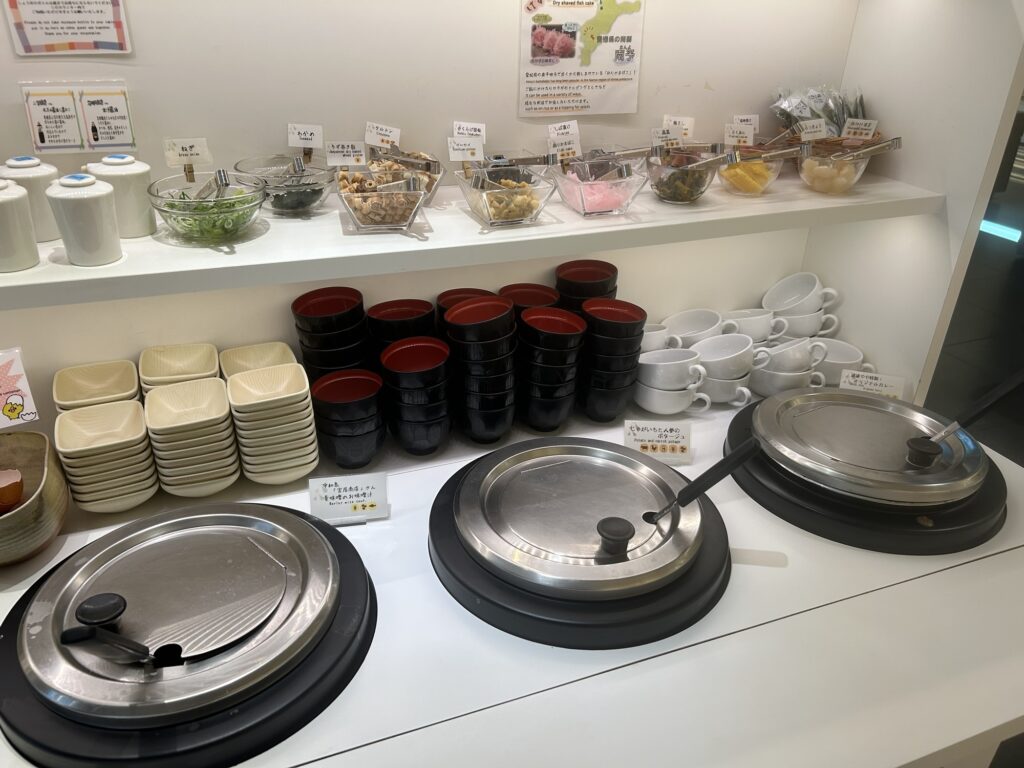 朝食ビュッフェでは、ごはんや汁物もしっかりそろっています。