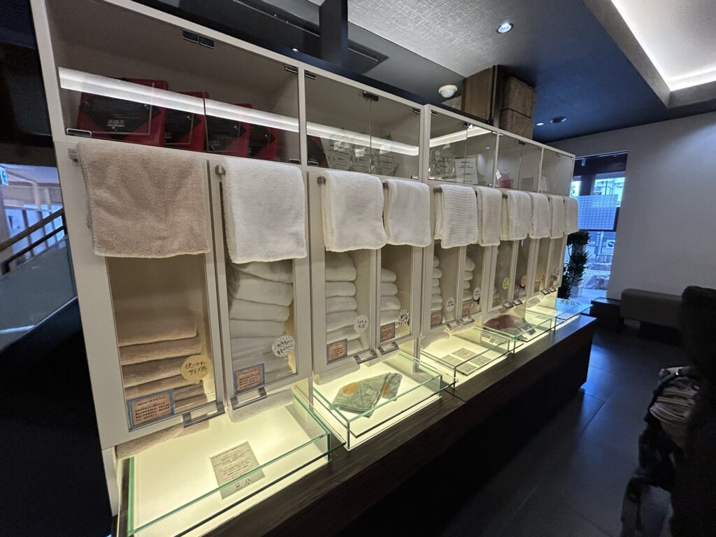 道後温泉の外湯を利用する人が持っていけるタオルとして用意されているサービスですが、実際に触ってみると、どれもとても柔らかくて驚きました。
