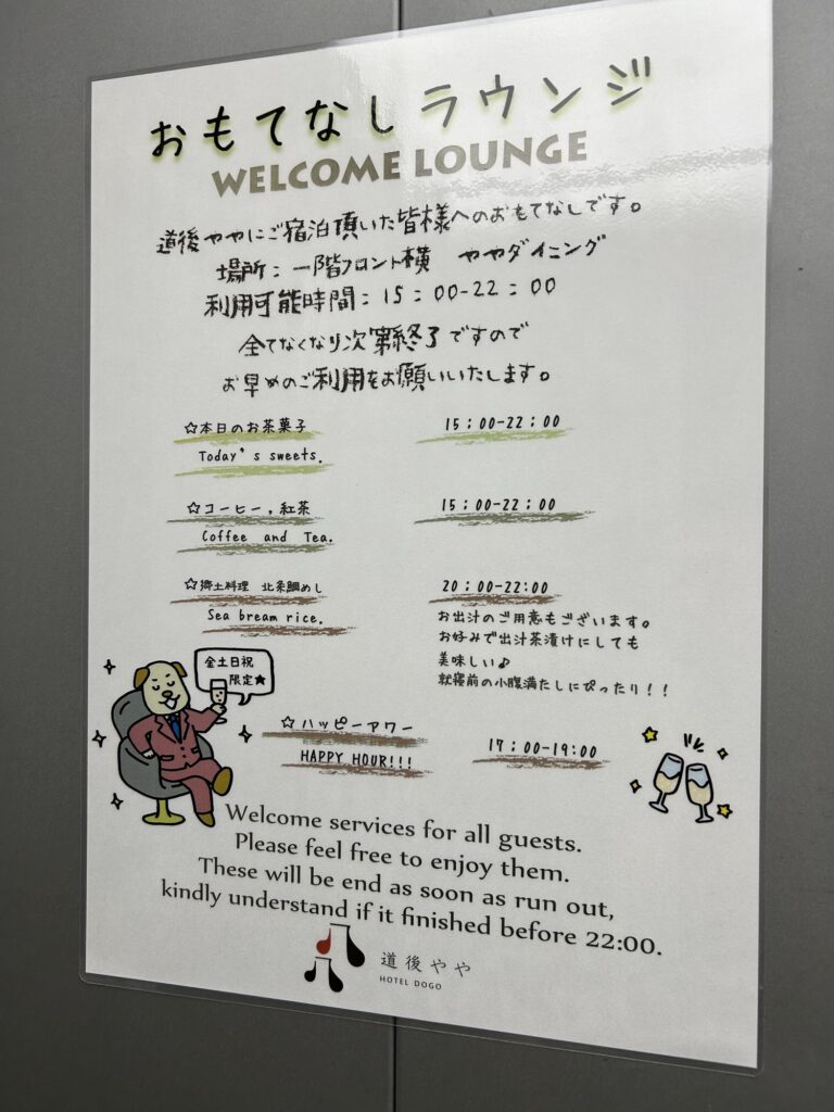 道後ややのラウンジは、到着後の休憩や夜の軽い食事にぴったりの空間でした。