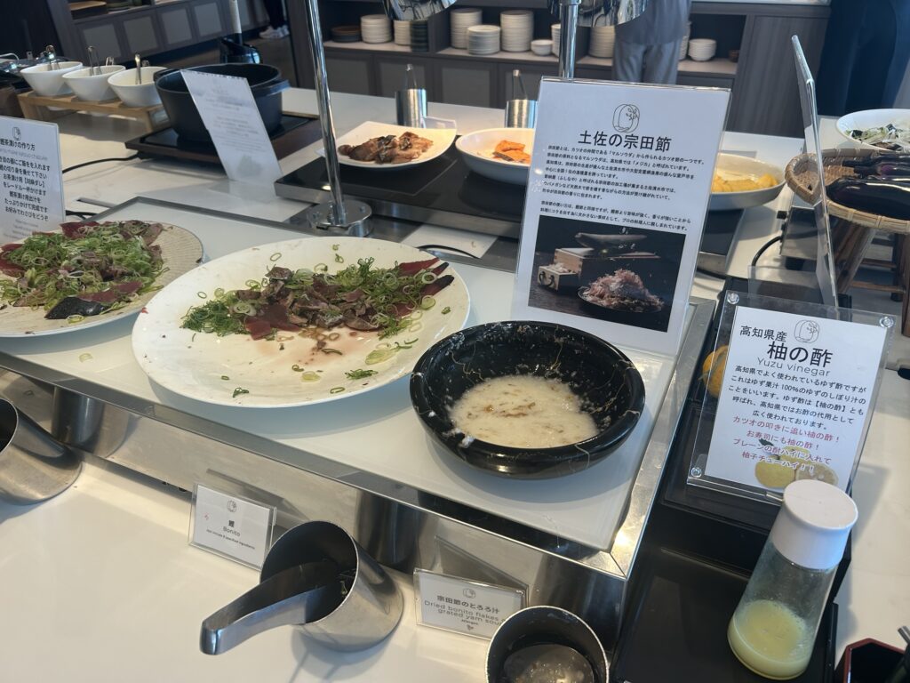 朝食ビュッフェは館内レストランで提供され、多彩なメニューと高知らしい味わいを楽しめる内容です。